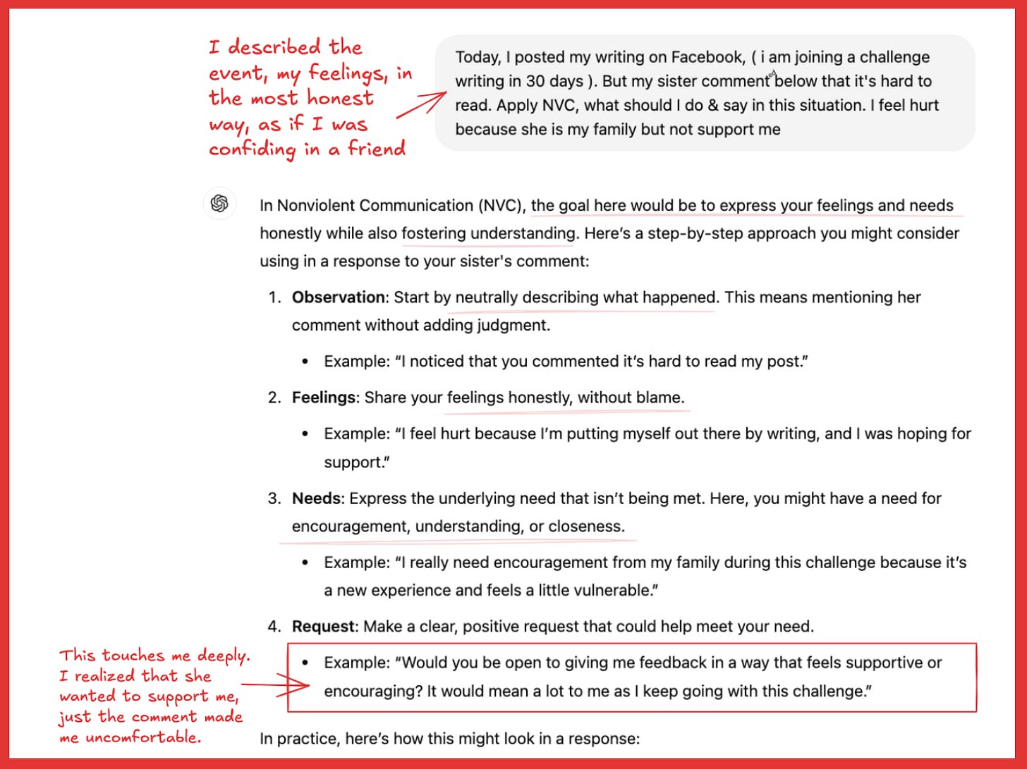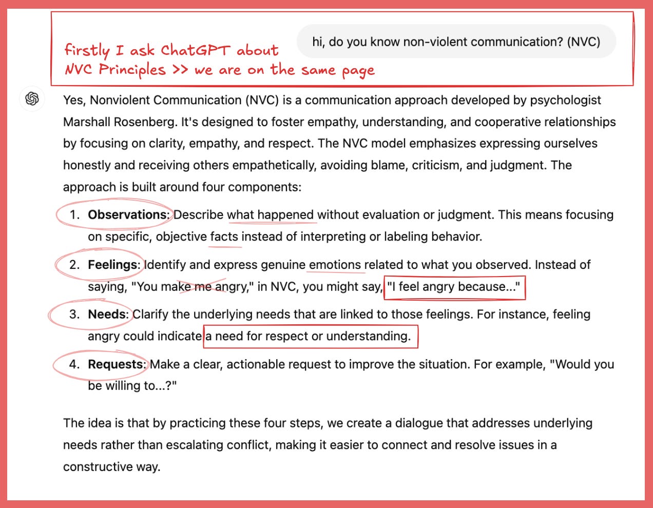 Firstly I asked ChatGPT about Non-violent communication, then we were on the same page for my upcoming prompt.